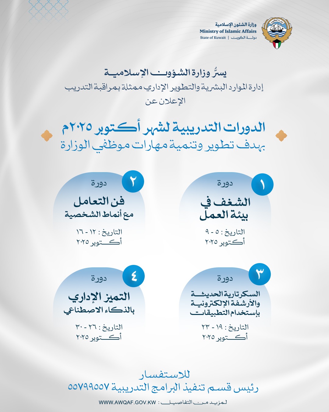 في إطار سعيها المستمر لتطوير القدرات البشرية وتعزيز كفاءة العاملين في مختلف قطاعاتها، أعلنت وزارة الشؤون الإسلامية ممثلةً بـ إدارة الموارد البشرية والتطوير الإداري – مراقبة التدريب، عن إطلاق الدورات التدريبية لشهر أكتوبر 2025م، والتي تأتي ضمن خطتها السنوية الرامية إلى تنمية مهارات موظفي الوزارة ورفع كفاءتهم الوظيفية والإدارية.