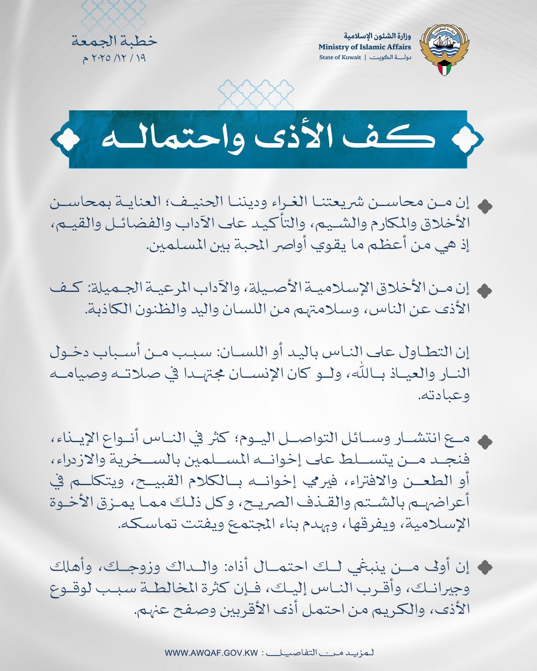 وَإِنَّ مِنَ الْأَخْلَاقِ الْإِسْلَامِيَّةِ الْأَصِيلَةِ، وَالْآدَابِ الْمَرْعِيَّةِ الْجَمِيلَةِ: كَفَّ الْأَذَى عَنِ النَّاسِ، وَسَلَامَتَهُمْ مِنَ اللِّسَانِ وَالْيَدِ وَالظُّنُونِ الْكَاذِبَةِ، فَفِي الصَّحِيحَيْنِ عَنْ عَبْدِ اللَّهِ بْنِ عَمْرٍو رَضِيَ اللَّهُ عَنْهُمَا، عَنِ النَّبِيِّ صَلَّى اللهُ عَلَيْهِ وَسَلَّمَ قَالَ: «الْمُسْلِمُ مَنْ سَلِمَ الْمُسْلِمُونَ مِنْ لِسَانِهِ وَيَدِهِ»، وَحَذَّر اللَّهُ تَعَالَى مِنْ إِلْحَاقِ الْأَذَى بِالْمُؤْمِنِينَ، وَتَوَعَّدَ عَلَى ذَلِكَ، قَالَ تَعَالَى: )وَالَّذِينَ يُؤْذُونَ الْمُؤْمِنِينَ وَالْمُؤْمِنَاتِ بِغَيْرِ مَا اكْتَسَبُوا فَقَدِ احْتَمَلُوا بُهْتَانًا وَإِثْمًا مُبِينًا( [الأحزاب:58].