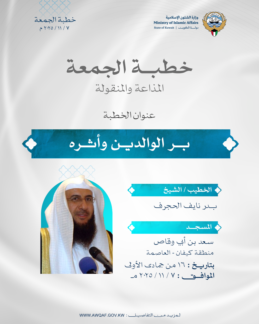 خطبة الجمعة المذاعة والموزعة بتاريخ 16 من جمادى الأولى 1447 هـ - الموافق 7 / 11 / 2025م