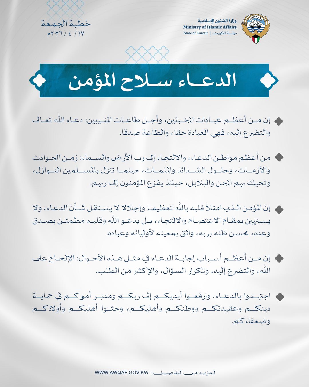فَاللَّهُمَّ صَلِّ وَسَلِّمْ عَلَى عَبْدِكَ وَنَبِيِّكَ مُحَمَّدٍ، وَارْضَ عَنْ أَصْحَابِهِ أَجْمَعِينَ، وَعَنَّا مَعَهُمْ بِرَحْمَتِكَ يَا أَرْحَمَ الرَّاحِمِينَ. اللَّهُمَّ أَعِنَّا عَلَى ذِكْرِكَ، وَشُكْرِكَ، وَحُسْنِ عِبَادَتِكَ، اللَّهُمَّ كُنْ لَنَا وَلَا تَكُنْ عَلَيْنَا، وَانْصُرْنَا وَلَا تَنْصُرْ عَلَيْنَا، وَاهْدِنَا، وَيَسِّرِ الْهُدَى لَنَا، اللَّهُمَّ احْفَظِ الْكُوَيْتَ وَأَهْلَهَا مِنْ كُلِّ شَرٍّ وَمَكْرُوهٍ، وَاجْعَلْ هَذَا الْبَلَدَ آمِنًا مُطْمَئِنًّا وَسَائِرَ بِلَادِ الْمُسْلِمِينَ، اللَّهُمَّ احْفَظْ إِخْوَتَنَا مِنَ الْمُرَابِطِينَ وَقُوَى الْأَمْنِ وَالدِّفَاعِ وَالْحَرَسِ الْوَطَنِيِّ وَجَمِيعَ الْقَائِمِينَ عَلَى أَمْنِ الْبِلَادِ، وَثَبِّتِ الْأَرْضَ تَحْتَ أَقْدَامِهِمْ، اللَّهُمَّ وَفِّقْ أَمِيرَنَا وَوَلِيَّ عَهْدِهِ لِمَا تُحِبُّ وَتَرْضَى، وَخُذْ بِنَوَاصِيهِمَا لِلْبِرِّ وَالتَّقْوَى، وَآخِرُ دَعْوَانَا أَنِ الْحَمْدُ لِلَّهِ رَبِّ الْعَالَمِينَ.