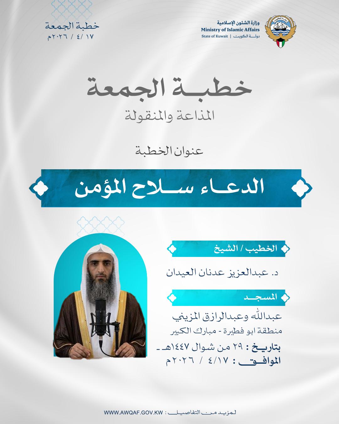 خطبة الجمعة المذاعة والموزعة بتاريخ 29 من شوال 1447 هـ - الموافق 17 / 4 / 2026م