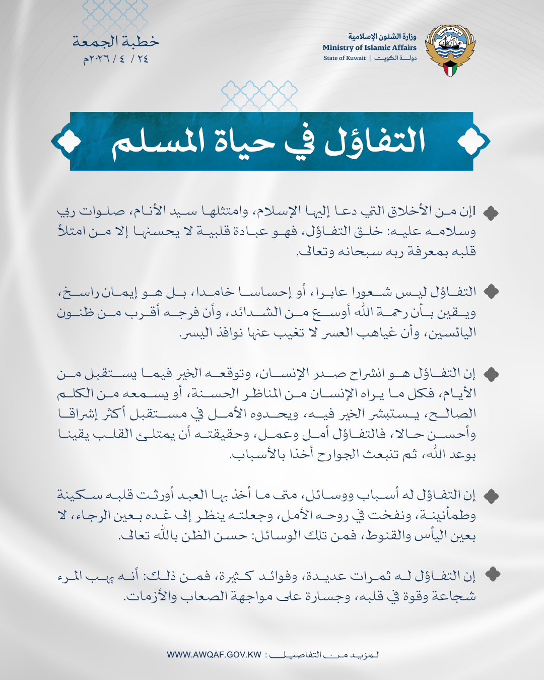 إِنَّ مِنَ الْأَخْلَاقِ الَّتِي دَعَا إِلَيْهَا الْإِسْلَامُ، وَامْتَثَلَهَا سَيِّدُ الْأَنَامِ، صَلَوَاتُ رَبِّي وَسَلَامُهُ عَلَيْهِ: خُلُقَ التَّفَاؤُلِ، فَهُوَ عِبَادَةٌ قَلْبِيَّةٌ لَا يُحْسِنُهَا إِلَّا مَنِ امْتَلَأَ قَلْبُهُ بِمَعْرِفَةِ رَبِّهِ سُبْحَانَهُ وَتَعَالَى، قَالَ اللَّهُ: ﴿ وَعَسَى أَنْ تَكْرَهُوا شَيْئًا وَهُوَ خَيْرٌ لَكُمْ وَعَسَى أَنْ تُحِبُّوا شَيْئًا وَهُوَ شَرٌّ لَكُمْ وَاللَّهُ يَعْلَمُ وَأَنْتُمْ لَا تَعْلَمُونَ﴾ [البقرة: ٢١٦] ، آيَةٌ تُرَسِّخُ دَعَائِمَ التَّفَاؤُلِ فِي قَلْبِ الْمُسْلِمِ، وَتُرَسِّخُ فِيهِ حُسْنَ الظَّنِّ بِاللَّهِ تَعَالَى، فَكَمْ مِنْ مَرِيضٍ ظَنَّ أَنَّ الشِّفَاءَ بَعِيدٌ، فَطَرَقَ بَابَ الرَّجَاءِ، فَجَاءَهُ لُطْفُ اللَّهِ مِنْ حَيْثُ لَا يَحْتَسِبُ، وَكَمْ مِنْ مَهْمُومٍ أَحَاطَتْ بِهِ الْكُرُوبُ، فَلَمَّا أَحْسَنَ قُوَّةً، بَعْدَ أَنْ صَدَقَتْ فِي اللُّجُوءِ إِلَيْهِ.