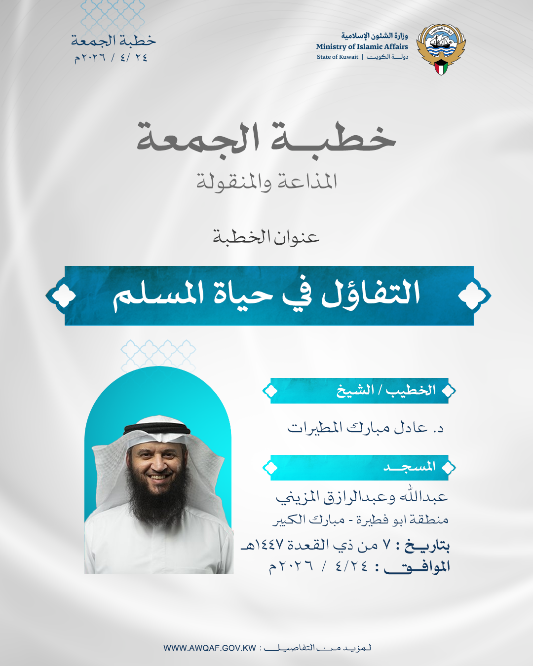 اللَّهُمَّ صَلِّ وَسَلِّمْ عَلَى عَبْدِكَ وَنَبِيِّكَ مُحَمَّدٍ، وَارْضَ عَنْ أَصْحَابِهِ أَجْمَعِينَ، وَعَنَّا مَعَهُمْ بِرَحْمَتِكَ يَا أَرْحَمَ الرَّاحِمِينَ. اللَّهُمَّ أَعِنَّا عَلَى ذِكْرِكَ، وَشُكْرِكَ، وَحُسْنِ عِبَادَتِكَ، اللَّهُمَّ كُنْ لَنَا وَلَا تَكُنْ عَلَيْنَا، وَانْصُرْنَا وَلَا تَنْصُرْ عَلَيْنَا، وَاهْدِنَا، وَيَسِّرِ الْهُدَى لَنَا، اللَّهُمَّ احْفَظِ الْكُوَيْتَ وَأَهْلَهَا مِنْ كُلِّ شَرٍّ وَمَكْرُوهٍ، وَاجْعَلْ هَذَا الْبَلَدَ آمِنًا مُطْمَئِنًّا وَسَائِرَ بِلَادِ الْمُسْلِمِينَ، اللَّهُمَّ احْفَظْ إِخْوَتَنَا مِنَ الْمُرَابِطِينَ وَقُوَى الْأَمْنِ وَالدِّفَاعِ وَالْحَرَسِ الْوَطَنِيِّ وَجَمِيعَ الْقَائِمِينَ عَلَى أَمْنِ الْبِلَادِ، وَثَبِّتِ الْأَرْضَ تَحْتَ أَقْدَامِهِمْ، اللَّهُمَّ وَفِّقْ أَمِيرَنَا وَوَلِيَّ عَهْدِهِ لِمَا تُحِبُّ وَتَرْضَى، وَخُذْ بِنَوَاصِيهِمَا لِلْبِرِّ وَالتَّقْوَى، وَآخِرُ دَعْوَانَا أَنِ الْحَمْدُ لِلَّهِ رَبِّ الْعَالَمِينَ.