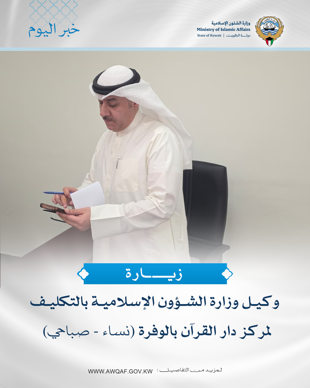 قام وكيل وزارة الشؤون الإسلامية بالتكليف الدكتور المهندس سليمان السويلم صباح اليوم بزيارة تفقدية إلى مركز دار القرآن الكريم (نساء – صباحي) بمنطقة الوفرة، وذلك في إطار حرص الوزارة على دعم العمل الدعوي والاطلاع على سير البرامج والأنشطة التعليمية والدعوية التي ينفذها المركز.