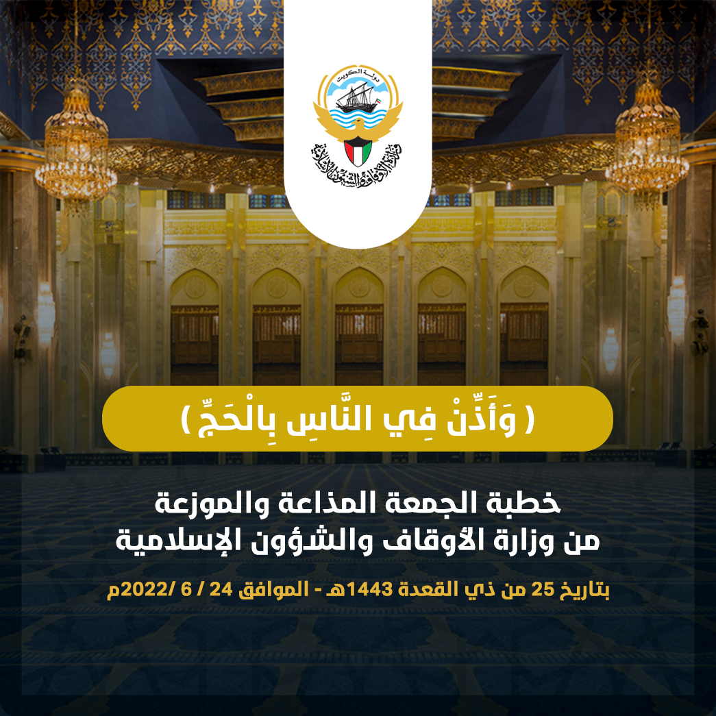 خطبة الجمعة المذاعة والموزعة من وزارة الأوقاف والشؤون الإسلامية بتاريخ 23 من ذي الحجة 1443هـ - الموافق 22 / 7 / 2022م
