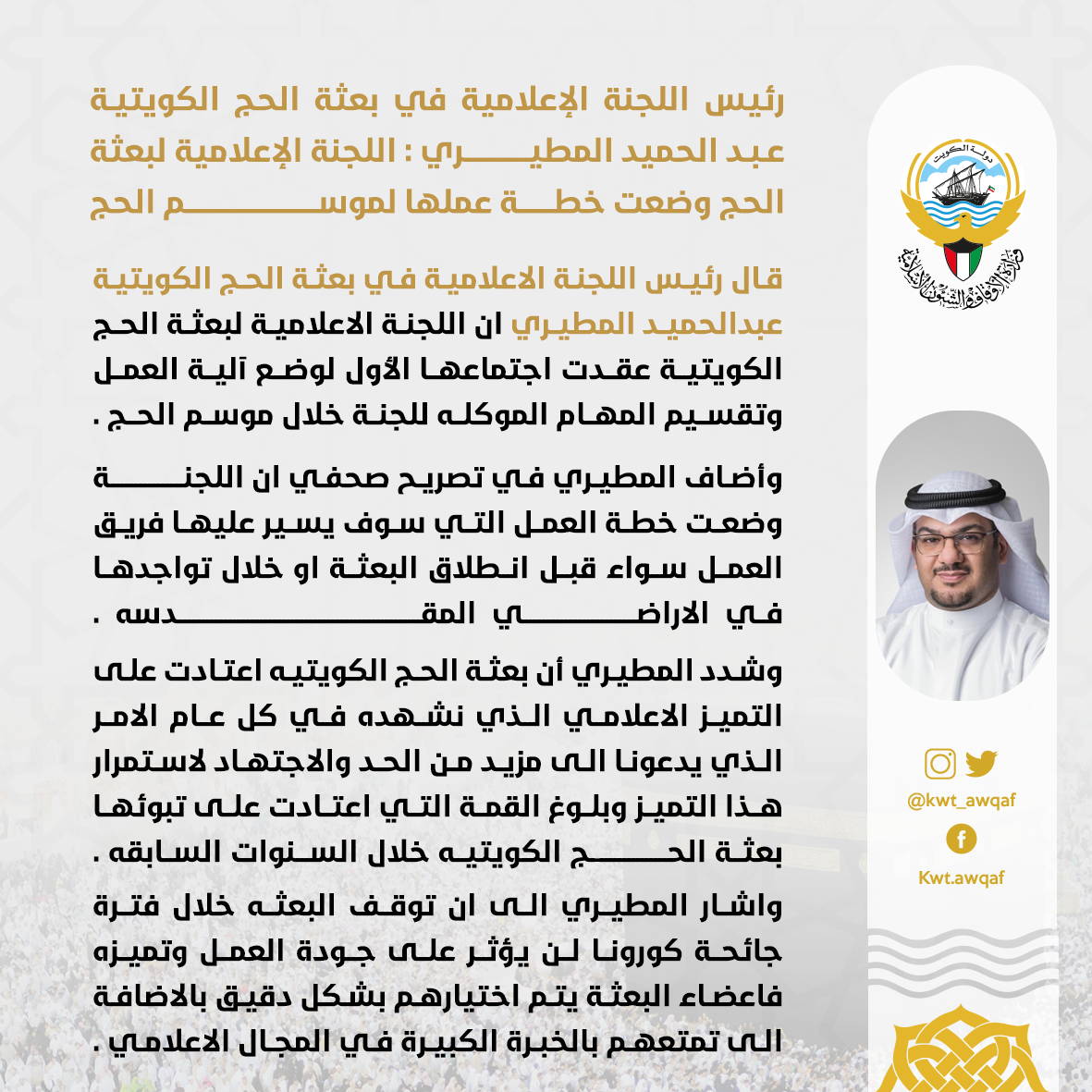 رئيس اللجنة الإعلامية في بعثة الحج الكويتيـة عـبـد الحميد المطيري : اللجنة الإعلامية لبعثة الحج وضعت خطة عملها لموسم الحج